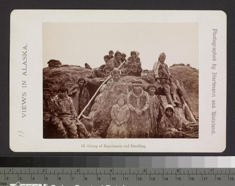 Photo of Alaska natives in their village with a kayaks and a dog.
