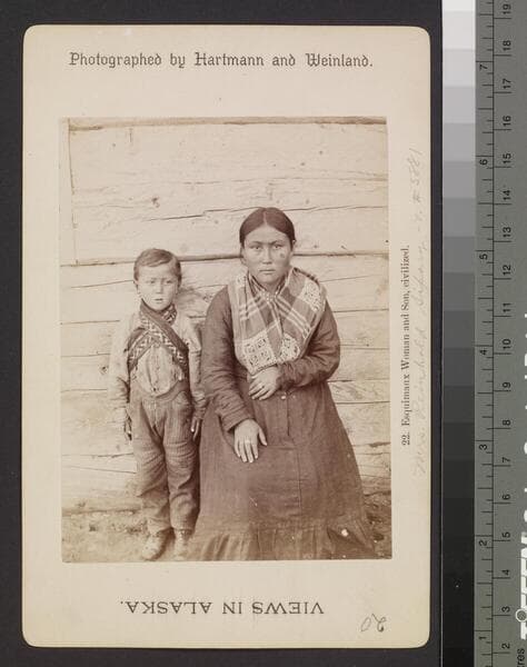 Photo of a native woman winnowing grain with a native man and child sitting in doorway to home.