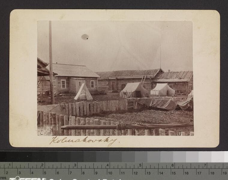 Photo of fort and trading post with wooden buildings, tents, and dogs.