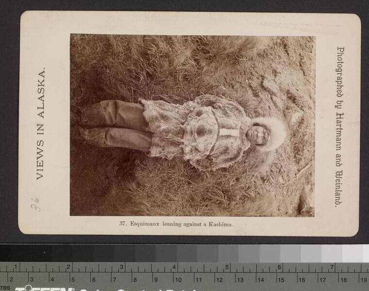 Zuni woman with baby in her lap, leaning against a wood ladder