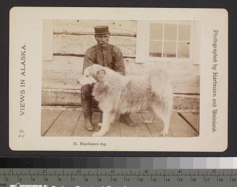 Photo of Alaska natives in their village with a kayaks and a dog.