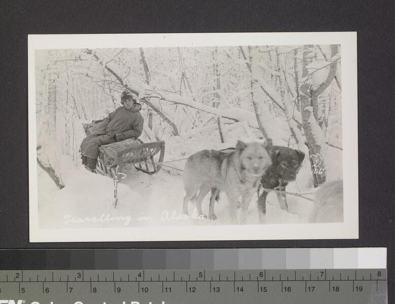 Photo of fort and trading post with wooden buildings, tents, and dogs.
