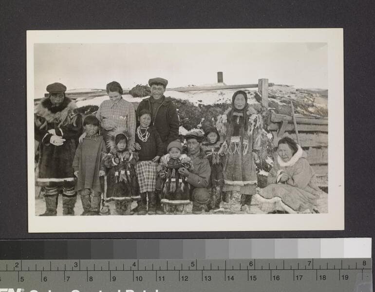 Photo of a missionary woman and children posing in front of a dwelling covered in snow.