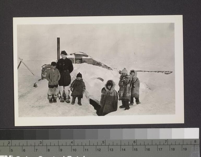 Photo of missionary woman and Alaskans posing in front of a dwelling.