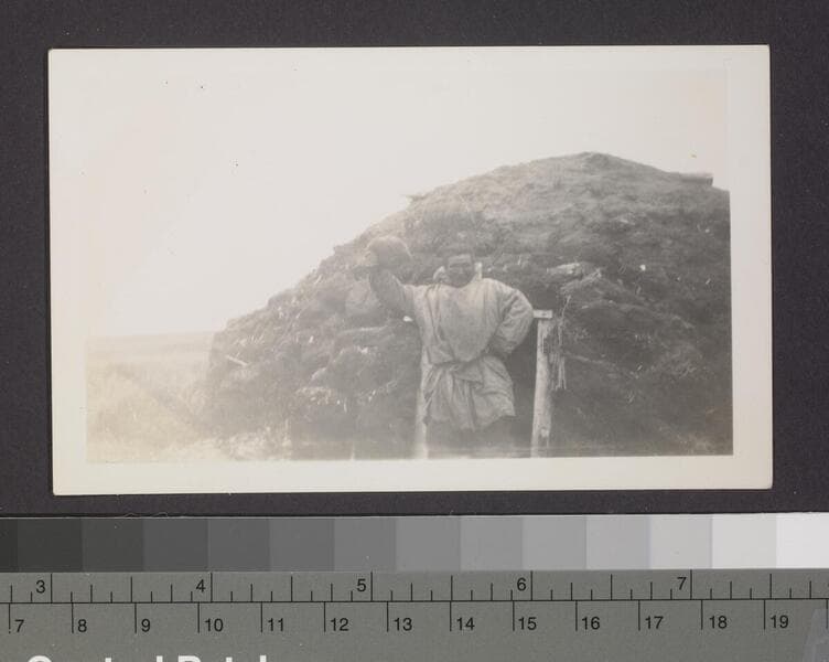 Photo of Alaska native posing beside dwelling.