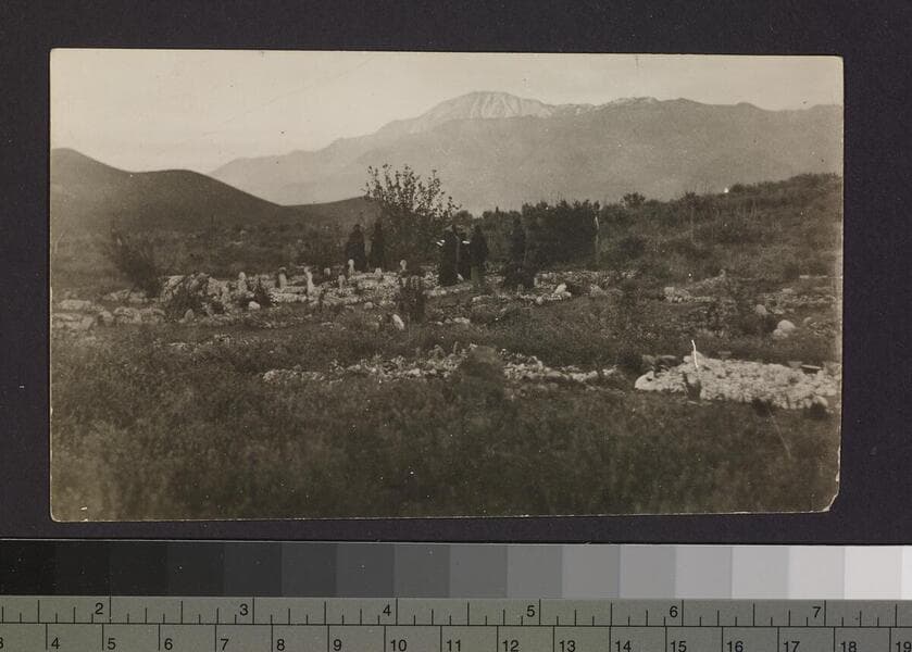 Photo of small group standing amongst graves.