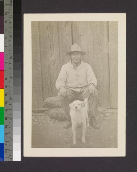 Photo of large family posing together, one man and woman seated, and dog to the left.