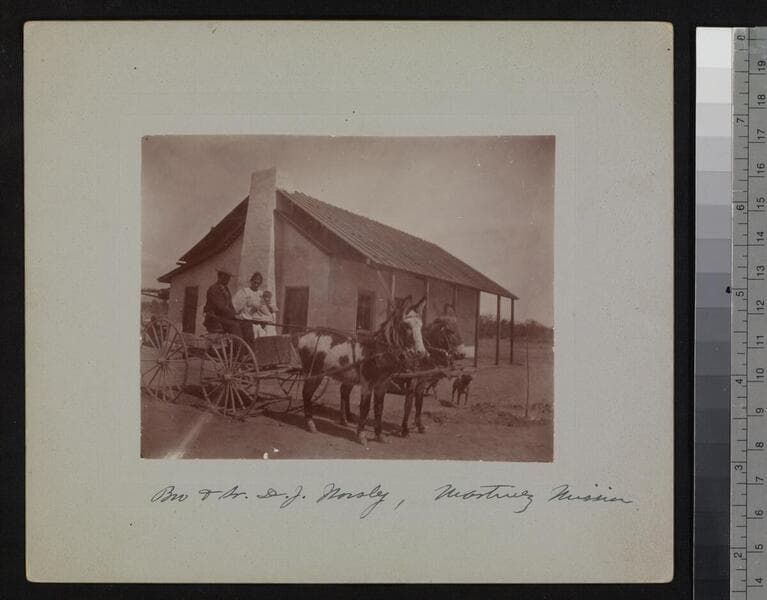 Photo of a man on a cart being pulled by donkeys along a dirt road with unidentified buildings.