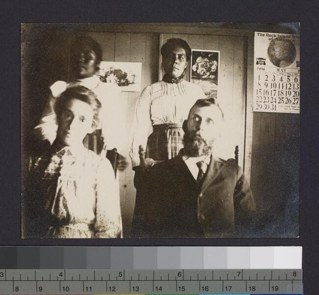 Portrait of seated man with a woman in a black dress standing on either side of him.