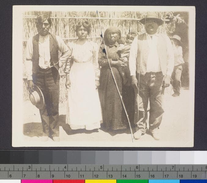 Men, women, and children at wooden structures in desert