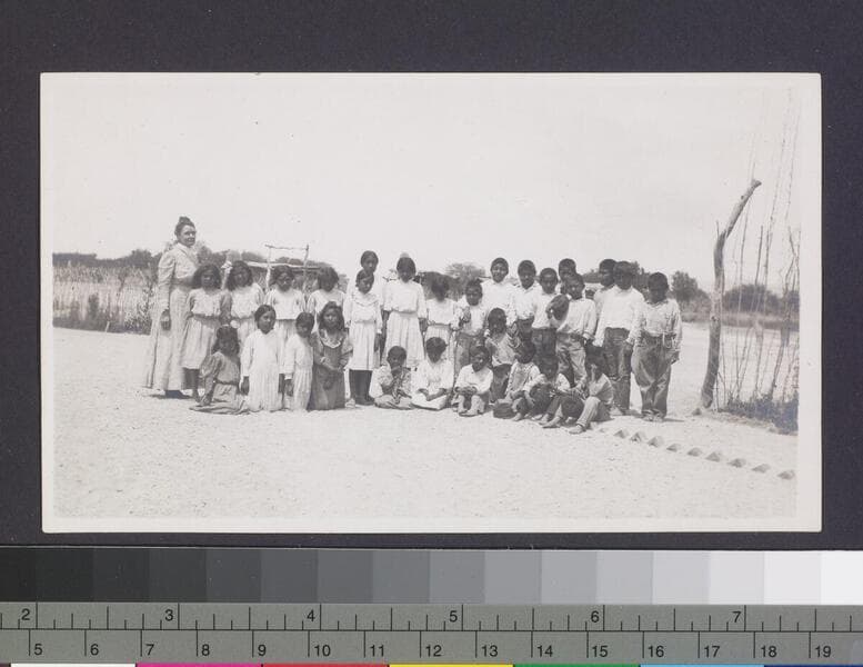 Photo of teacher with her pupils sitting on schoolhouse steps.
