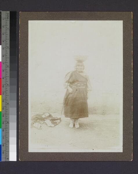 Studio portrait of a young Pueblo Indian woman carrying an olla or water jar on her head. Blankets and painted pottery and a basket are at her feet.