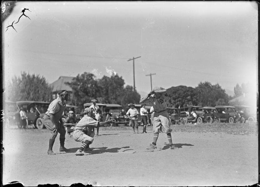 Image of baseball players on a field playing a game of baseball in Temescal Canyon in Pacific Palisades, California, region, with a wooden building in the background.