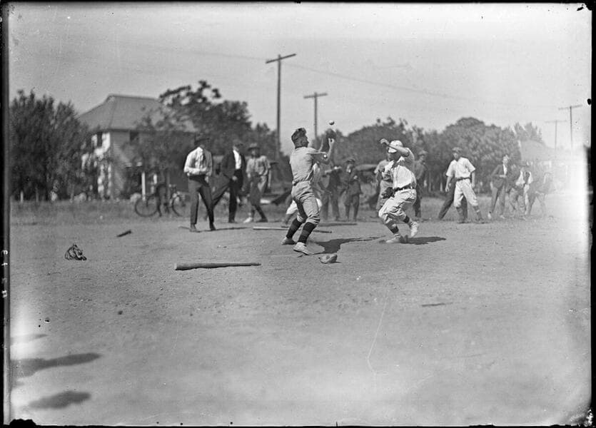 Photo of batter ducking and catcher going for the ball, spectators watching from sidelines.