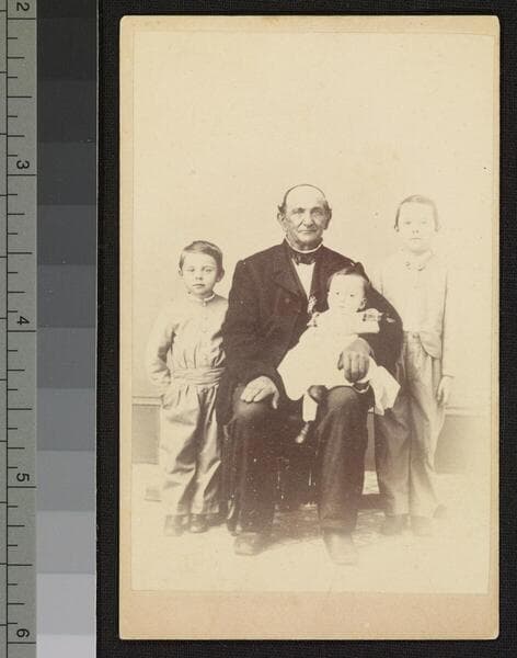 Portrait of seated man with a woman in a black dress standing on either side of him.