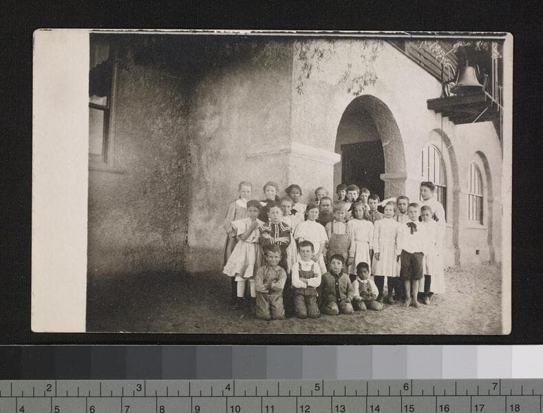 Photo of teacher with her pupils sitting on schoolhouse steps.