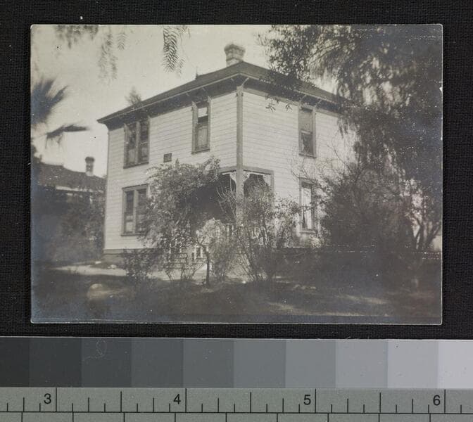 Exterior of a two story adobe house with an upstairs porch. the house is surrounded by a picket fence.