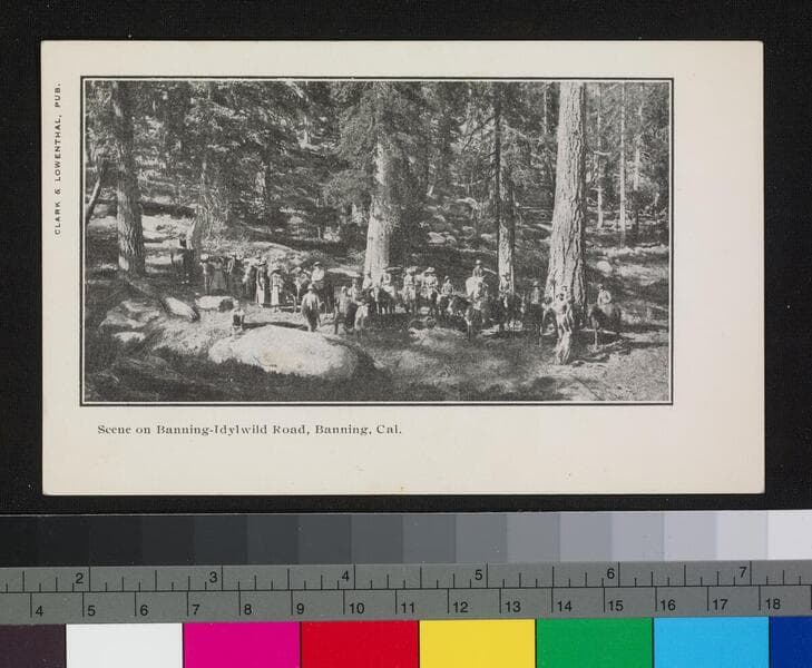 Wide view of several rows of bee hive boxes in an open area at the apiary of Conrad Schliesmayer in Pasadena, California. A woman, two children, and two men stand among the boxes. One man stands next to a camera on a tripod. A windmill, water tanks, outbuildings, tree, and horses also dot the landscape.