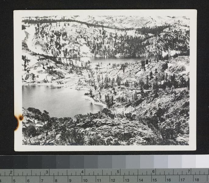 Photo of a frozen over lake and its surrounding mountains, snow, and trees.