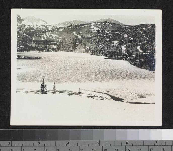 Photo of a lake and its surrounding mountains, snow, and trees.