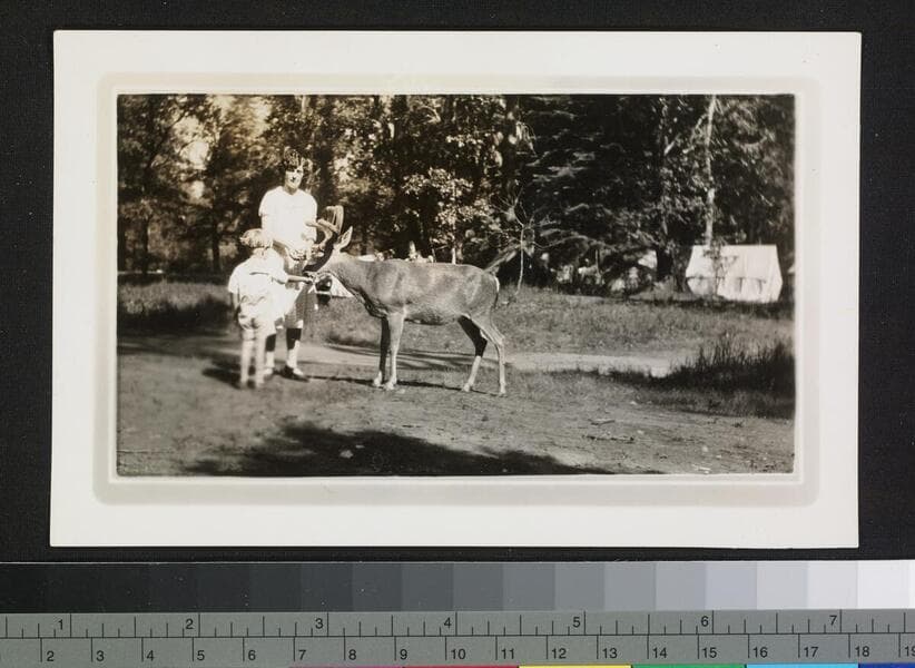 Woman and child feeding a deer