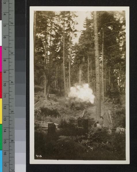 Image of soldiers fighting British troops in the Battle of Monmouth in New Jersey in 1778 during the American Revolutionary War; men shoot from cover at British troops in the distance at left; a woman loads a cannon, with a child ready to ignite it, near wounded and dead men; officers on horseback direct a rank of riflemen at right.