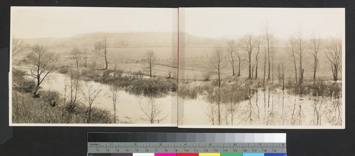 Photo of a lake with a grassy patch of land in the middle with some buildings, and trees in the foreground.