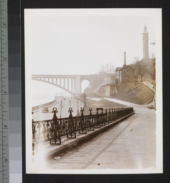 Photo of an evening skyline with High Bridge Tower and the top of George Washington Bridge in the distance.