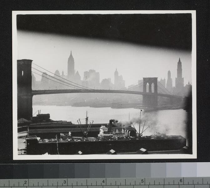 Image of an elevated cityscape view of the Brooklyn Bridge in New York City looking southeast towards Brooklyn and showing the city and boats in the East River; caption at bottom margin centered.