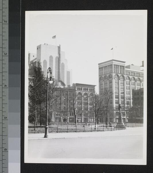 Photo of the tops of various buildings and the Hudson River in the distance.