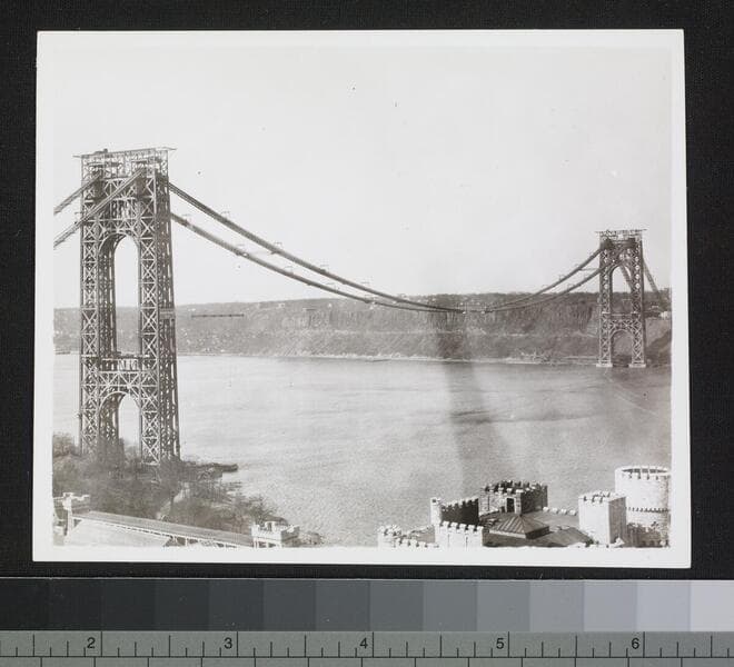 Photo of roof tops and an unfinished George Washington Bridge through some mist.
