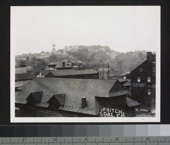 A panoramic view of an industrial tract of land near City Terrace, in eastern Los Angeles. Some of the businesses that are visible are the Hall-Johnson Co. (paving), Western Concrete Pipe Co., Brace Lumber, and Pacific Gypsum Tile Co. The businesses are fairly widely spaced, with small gatherings of trees in places. Writing in white at bottom of image reads "City Industrial Tract". Writing in white at the bottom to the left reads "Photo no. 490 ; The Aerograph Co. ; 5880 Moneta ; Los Angeles, Calif."