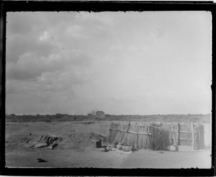 Photo of a native man standing near multiple structures made from brush and wooden poles.
