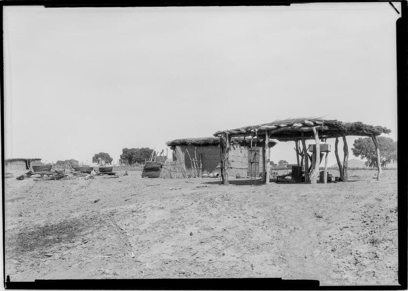 Photo of a native man standing near multiple structures made from brush and wooden poles.