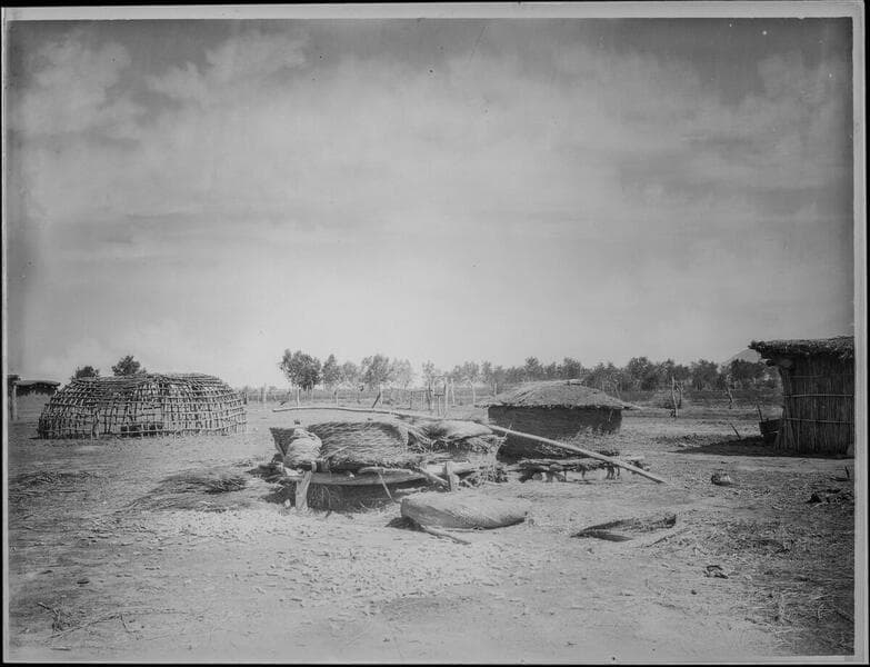 Photo of a native woman kneeling beside a large grain basket with a metate.