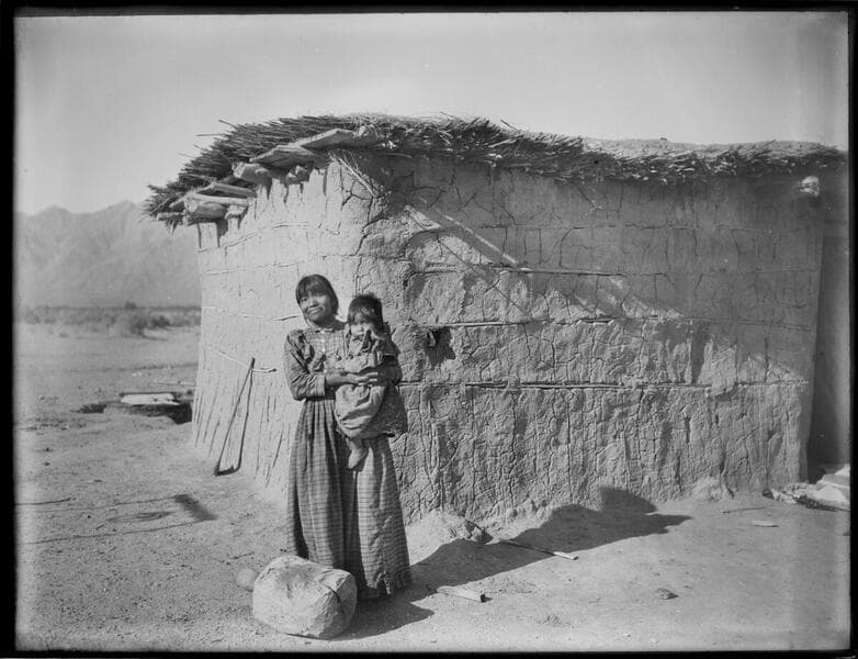 Photo of and adobe dwelling with a native woman standing in front and a native woman and child on the second story.