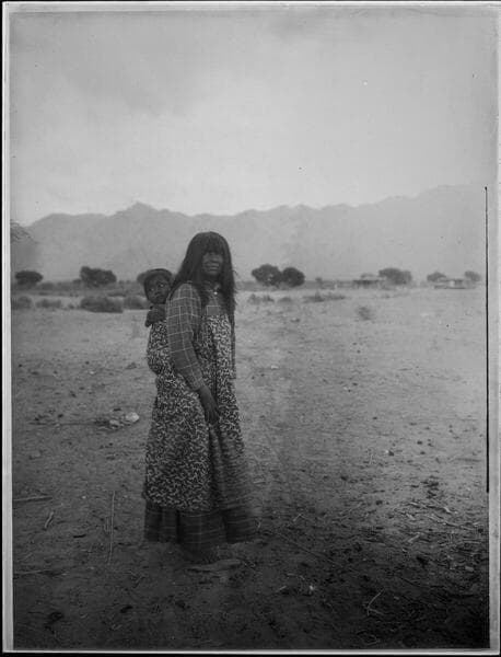 Photo of a native woman holding a child while standing in front of an adobe building with a thatched roof.