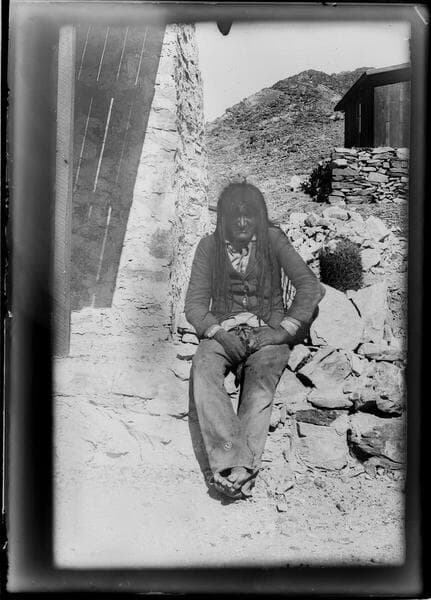 Photo of an old Hopi man sitting in a small entrance way to a house with his feet on a ladder.