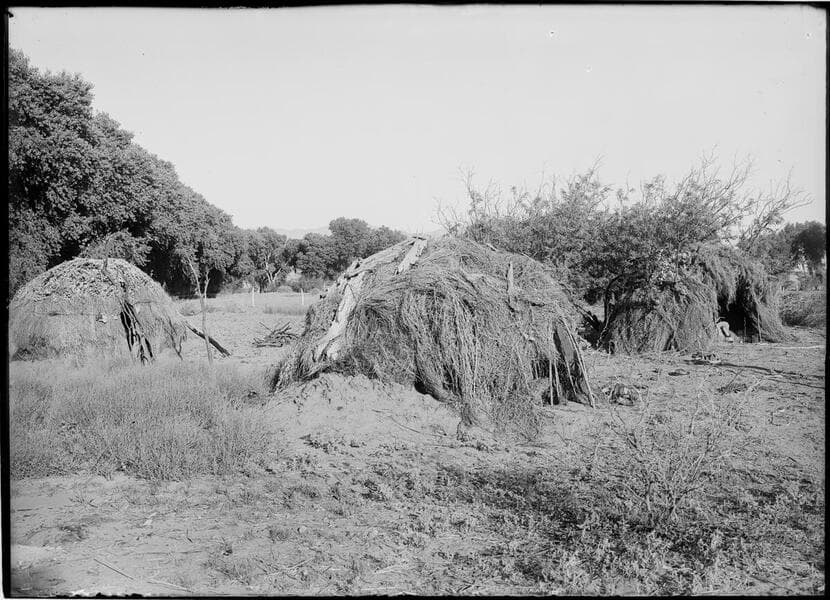 Photo of a native family. A woman seated is with three children and a man stands beside them. There is a wagon with three children in the distance.