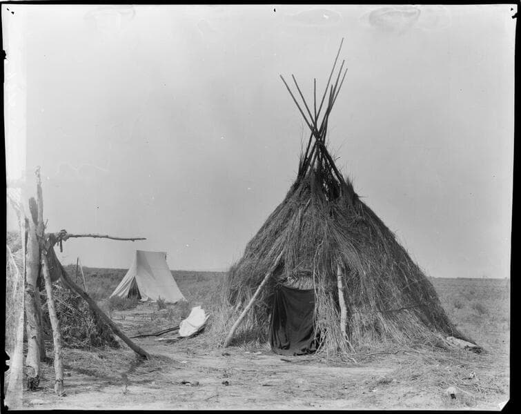 Photo of a native resting in a wickiup.