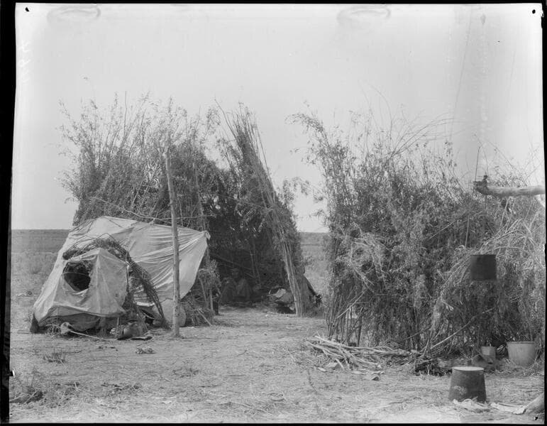 Photo of native woman seated on the floor with two native men, one seated on wood plank, the other standing with a rifle.
