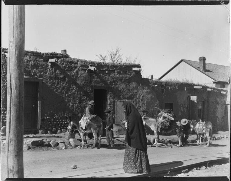 Photo of two men riding donkeys past adobe homes, wall posters for opera (The Rose) and Seligman Bros., Santa Fe., General Merchandise behind them.