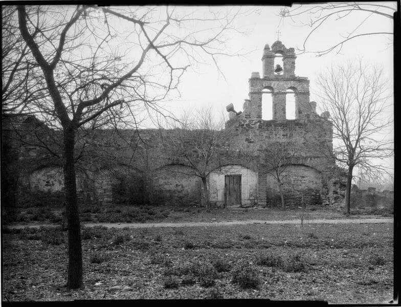 Image of the Mission San Juan Capistrano in San Juan Capistrano, California, with automobiles in front and an El Camino Real bell.