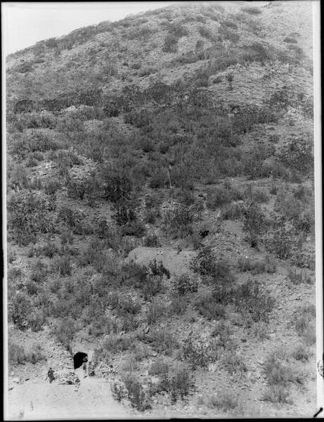 Photo of a mountain side with two tunnel openings, men sitting and standing in front of them.