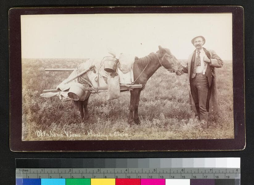 Oklahoma views: Hunting a claim [Man in suit and hat with packhorse. Mitchell and De Groff, photographers]