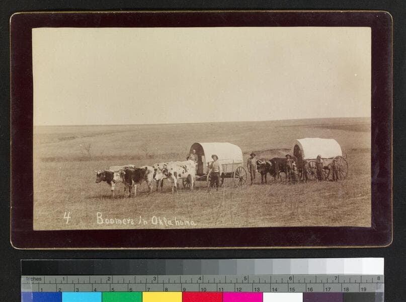 Boomers in Oklahoma [Men, women, and children crossing field in oxen-pulled covered wagons]