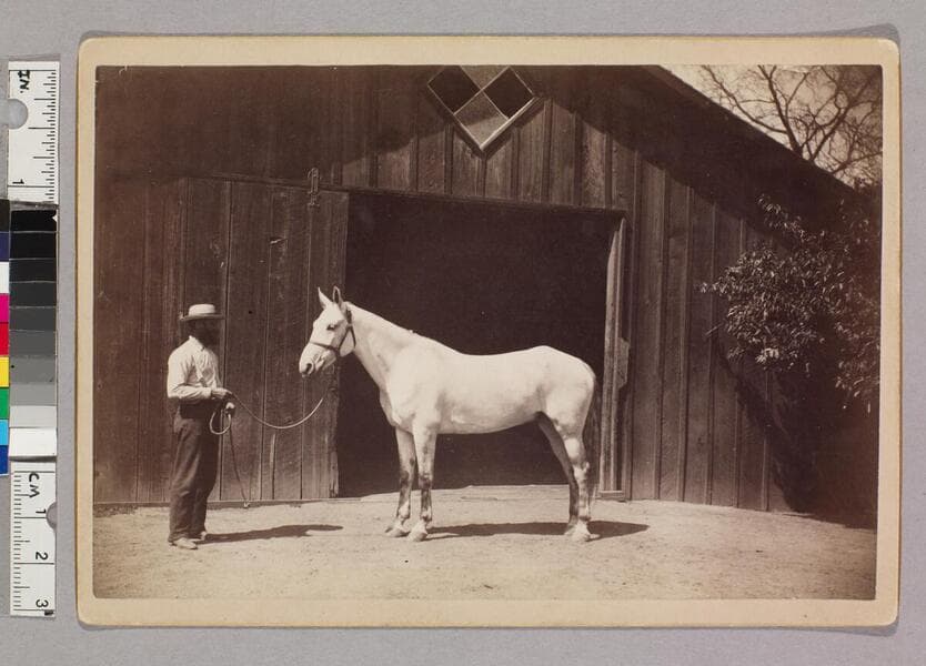 A horse-drawn cart and two laborers in the middle of a vineyard, seen from a distance. Mountains in the background.