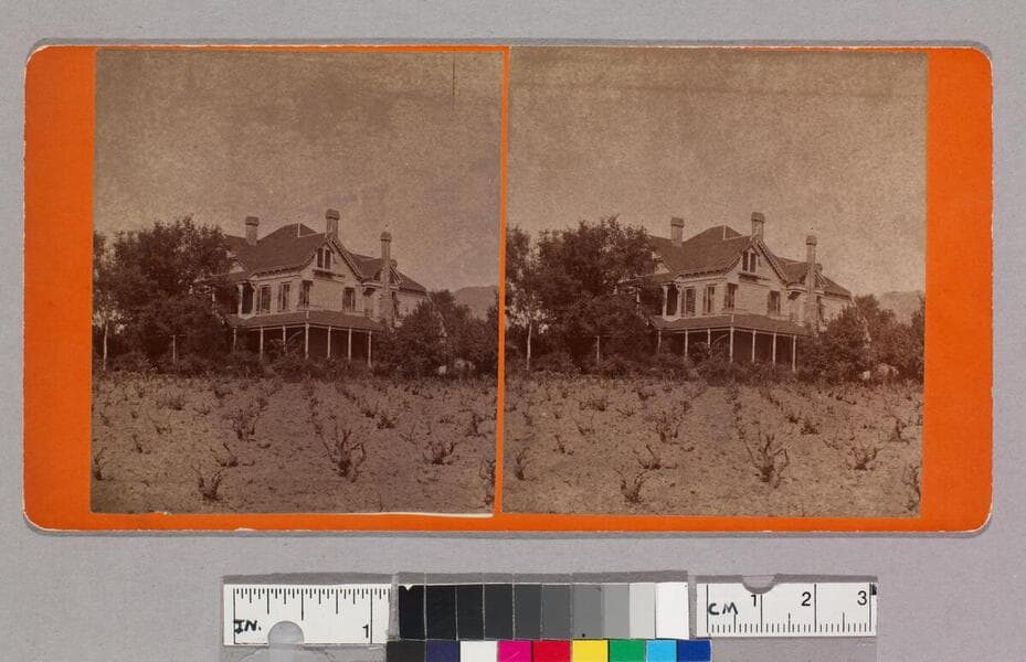 This collection consists of one photograph album with 48 photographs and 35 loose photographs (as well as some duplicates), with images depicting the Fair Oaks Ranch in Altadena, California, during the late 19th century. The ranch, owned by businessman and rancher James F. Crank, encompassed a vineyard, winery, and citrus orchards, along with a lavish residence and grounds. Subjects include interior and exterior views of the residence, landscaped grounds, trees, and plant life; members of the Crank family; ranch workers, including Chinese laborers, working in the orchards and vineyard, harvesting and packing fruit, drying apricots, and loading fruit onto horse-drawn carts; workers' quarters; the operations of the winery and distillery; and also a handful of sweeping views of the San Gabriel Mountains and the Altadena and Pasadena areas taken from vantage points on the property. The photographer of the album is unknown; some of the cabinet cards and stereographs have imprints from area photographers: C. McMurtrey (Item 80), C.B. Ripley (Items 73-74), and A.C. Varela (Items 76-78). Photographs in the album are cyanotype prints; the loose photographs include cyanotypes, cabinet cards, and stereographs.