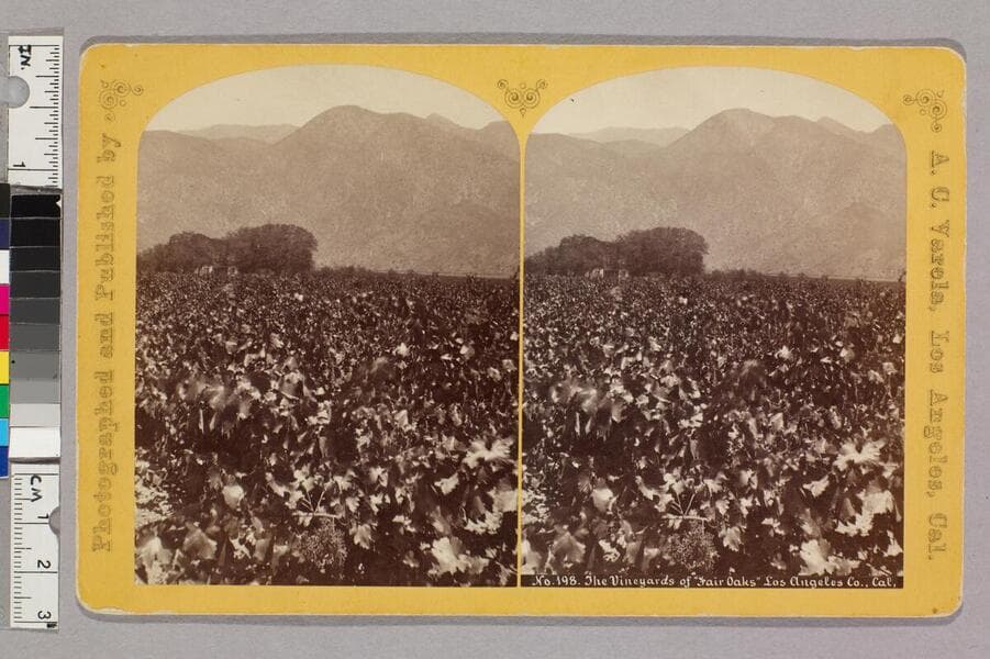Four laborers work in a vineyard on the Lake Vineyard estate owned by Benjamin Davis Wilson in San Gabriel (now mainly part of San Marino, California), surrounded by rows of grape vines, with winery buildings in the background, the James De Barth Shorb house visible on a hill at right, and the San Gabriel Mountains in the distance.