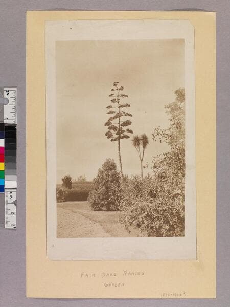 A slightly elevated view of the desert garden with a path on the left and two tall plants in the foreground. MS notes on verso read "Desert garden, lower section c. 1930" and "lower section about 1930."
